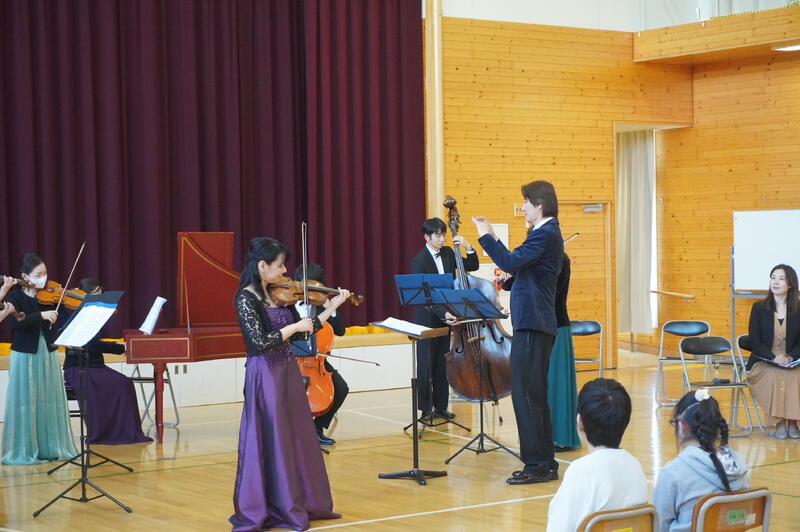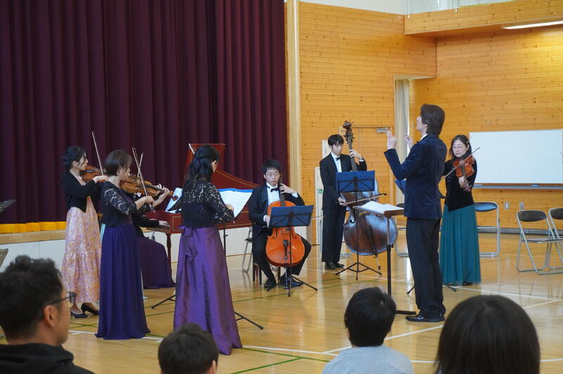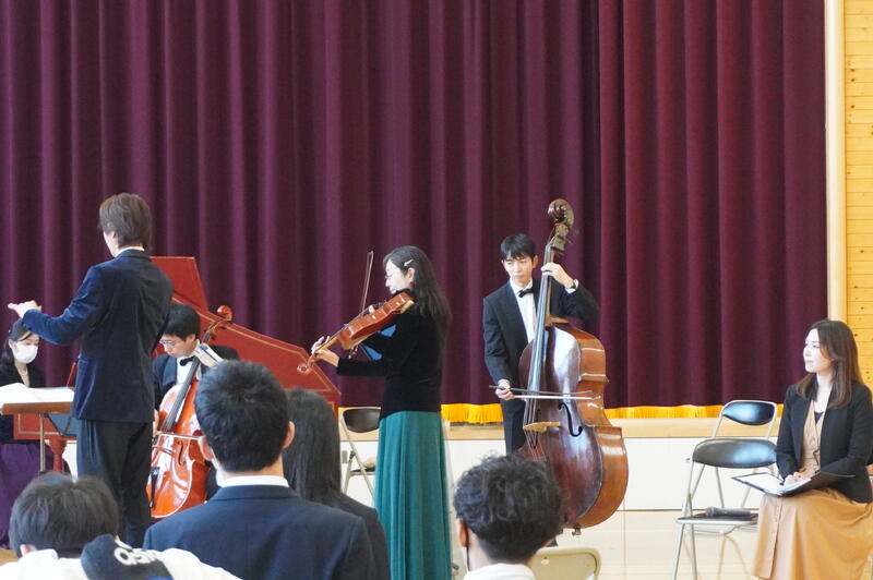 11月27日(木)に日本テレマン協会による学校巡回公演が実施されました。バロック音楽をテーマに、ワークショップと本公演の二部構成で行われました。ワークショップでは、バロック音楽の特徴や当時の生活・文化についてのお話を伺いました。また、実際にバロックダンスにも挑戦し、音楽に合わせて身体を動かす楽しさを味わいました。本公演では、オーケストラ演奏が行われ、「G線上のアリア」や「ビリーヴ」など、生演奏ならではの迫力や躍動感を体験することができ、貴重なひとときとなりました。